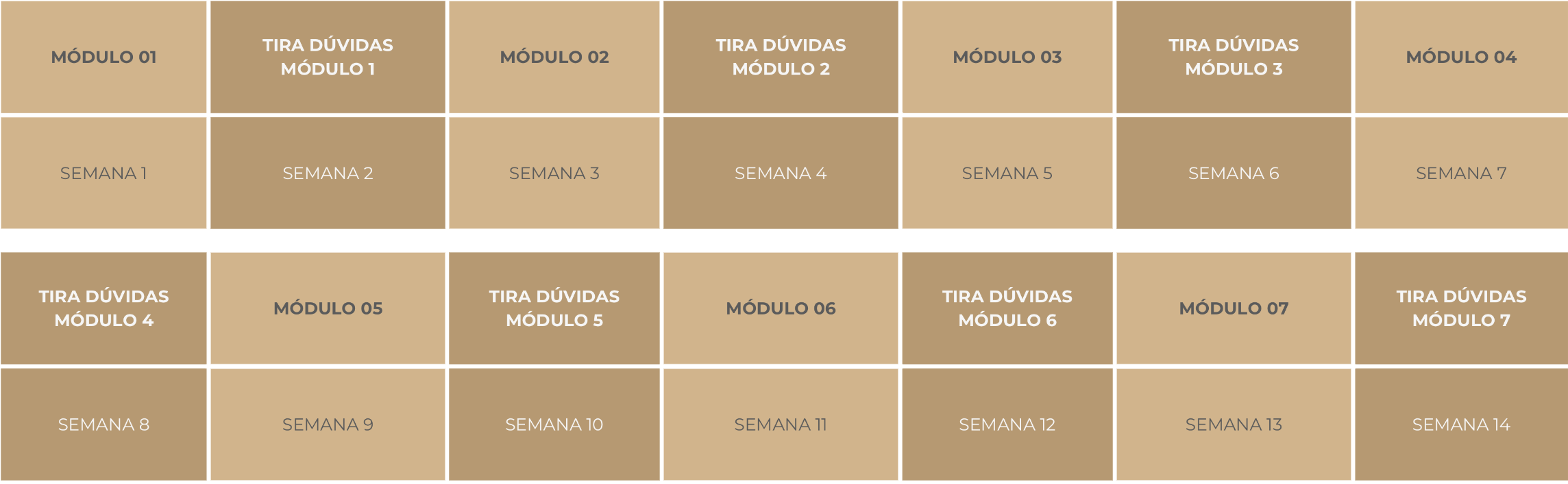 Você terá acesso ao conteúdo completo, aos encontros ao vivo e ao espaço de tira-dúvidas em cada módulo.